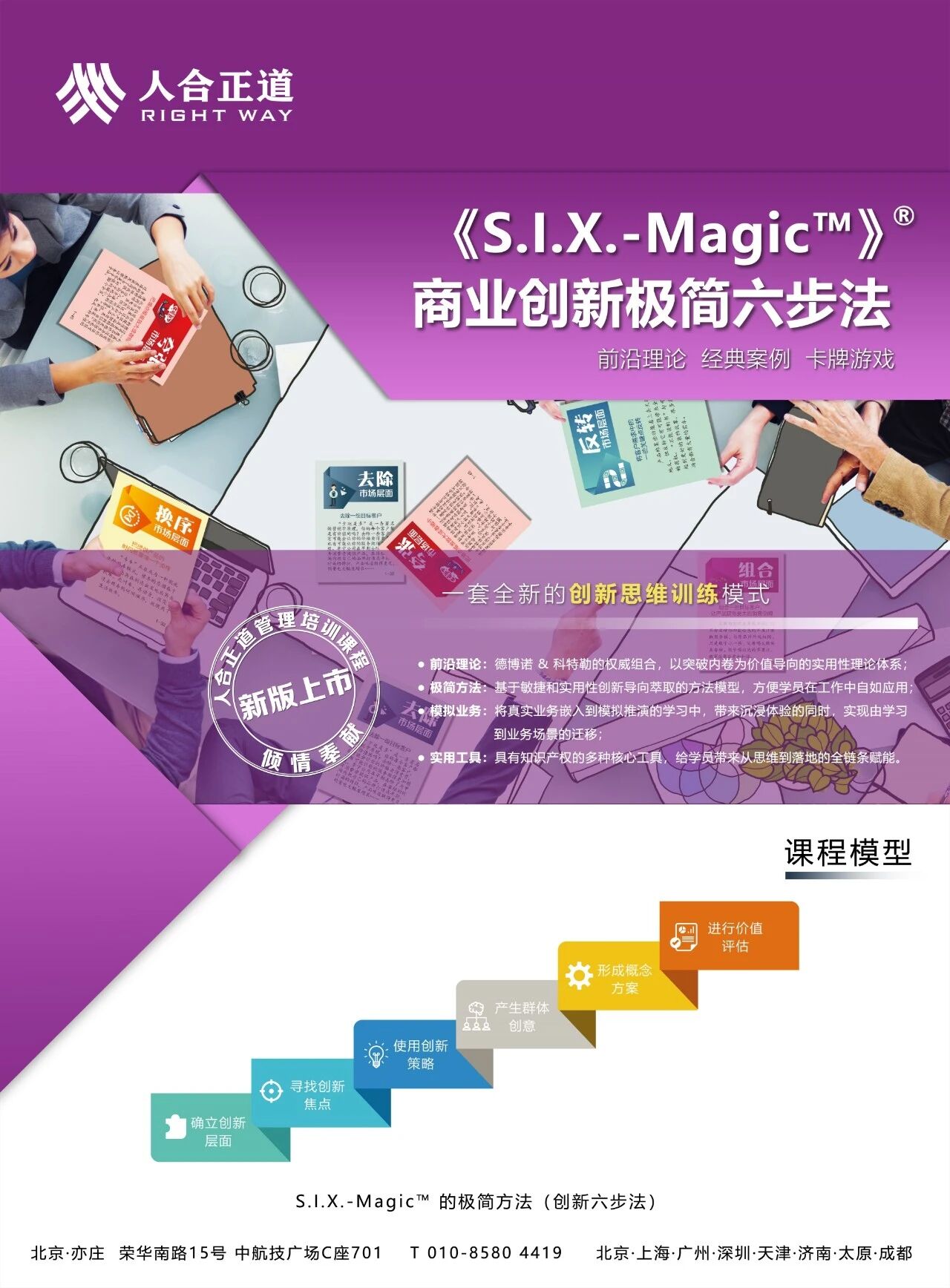 人合正道依据多年商业模拟培训咨询、定制化服务经验,贴合当下内卷竞争态势,提出场景化创新工具“创新六步法”。极富指导性的创新六步流程,结合沙盘推演、丰富的创新案例卡牌,推出版权课程《S.I.X.-Magic™》®商业创新极简六步法(沙盘)。